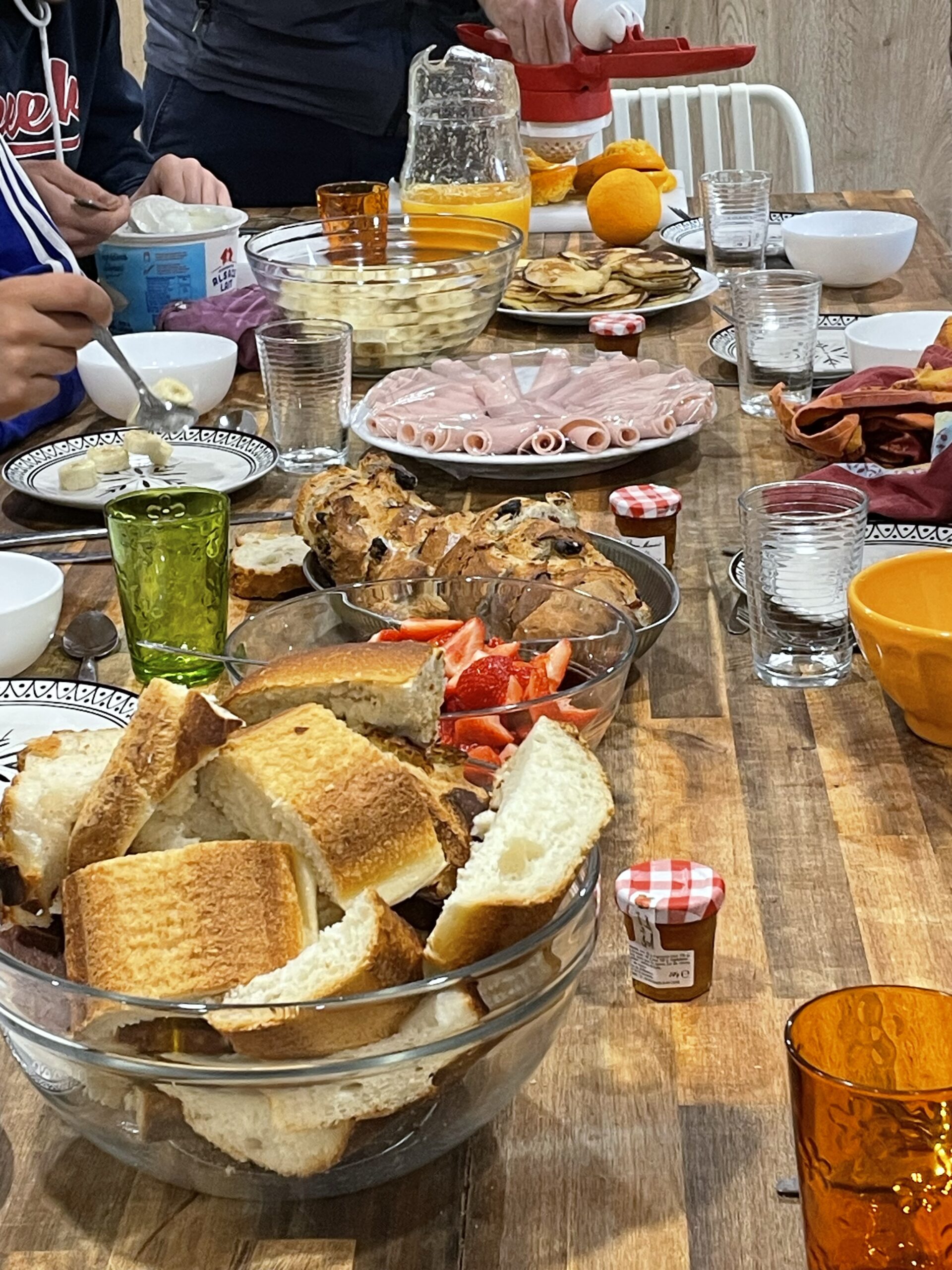 En plus des pancakes et des œufs brouillés, on a mangé des petits haricots rouges, du jambon, du pain avec des raisins secs, de la confiture et du fromage blanc avec des morceaux de bananes et de fraises dedans.