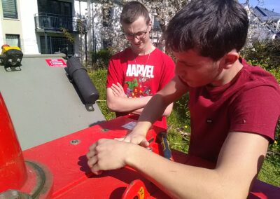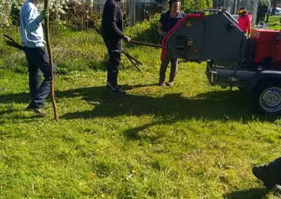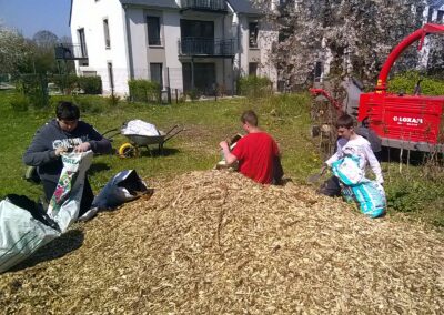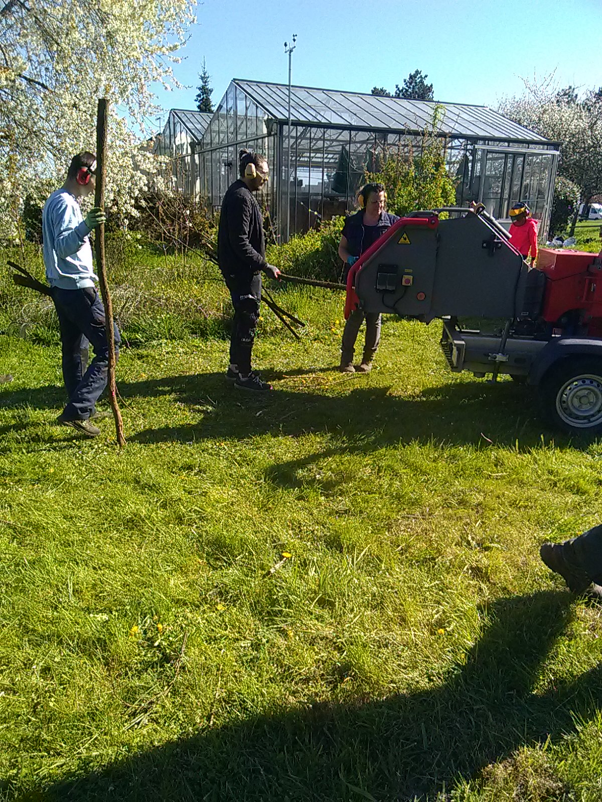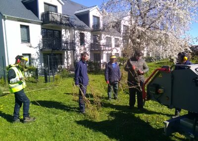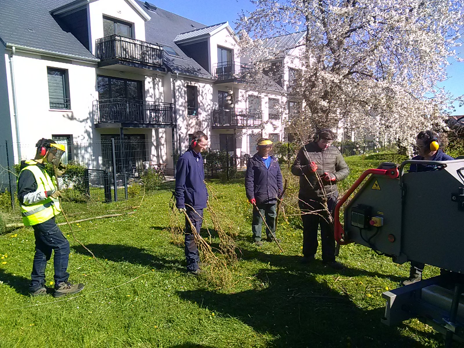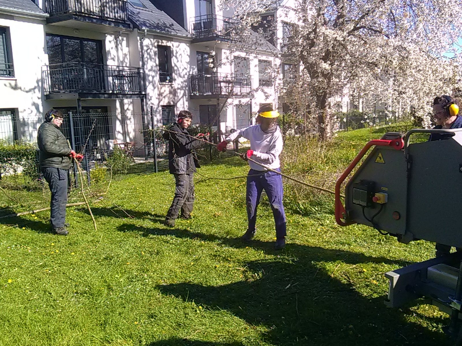 Durant la première semaine des vacances d’avril 2025, après avoir pris connaissance des consignes de sécurité et observé le broyeur en fonctionnement, les jeunes de l’atelier “travaux horticoles” ont, pendant cinq jours, réduit le tas de branches en copeaux de bois.